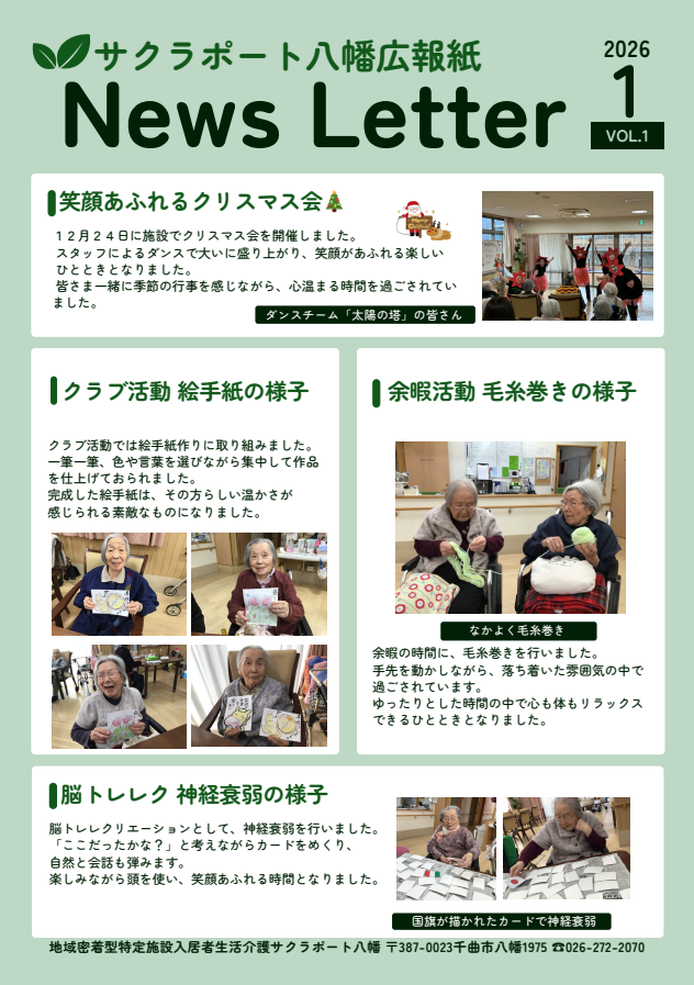 サクラポート八幡です。 広報紙をリニューアルしました。今後ともよろしくお願いいたします。 今回は12月のクリスマス会の様子やクラブ活動の様子を載せました。 どうぞご覧下さい。