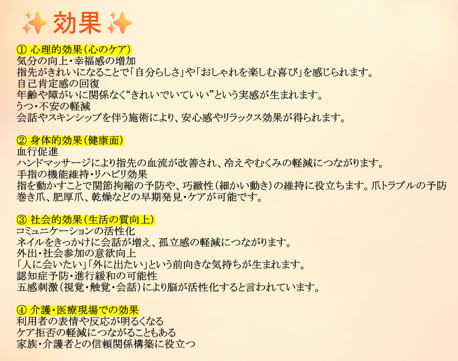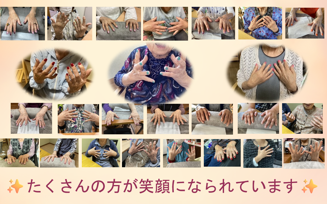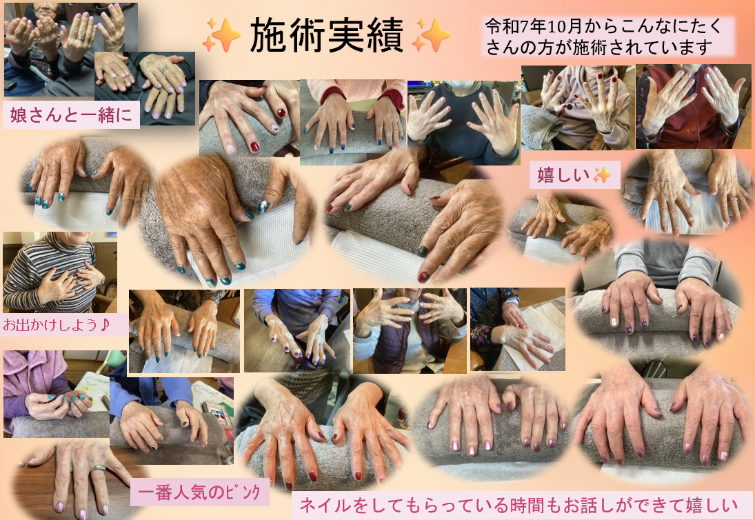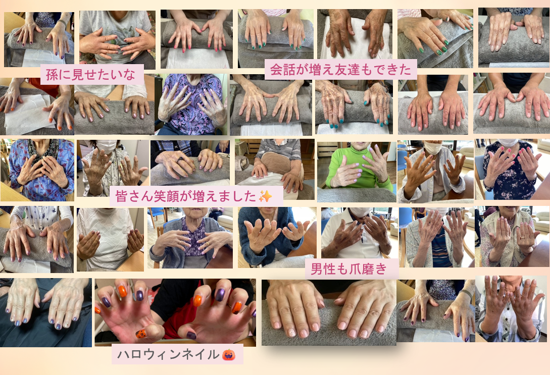 施術中にもお話しをすることで気持ちへの変化があり ネイルをして周りから声をかけてもらい会話が増える、外に出かけたくなるなど たくさんの方から喜びのお声をいただいています。