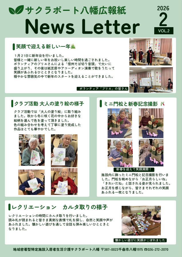 サクラポート八幡です。 今回は1月の新年会の様子やクラブ活動の様子を載せました。 ボランティアのプリエさんによる「信州そば切り音頭」では大いに盛り上がりました。 どうぞご覧下さい。