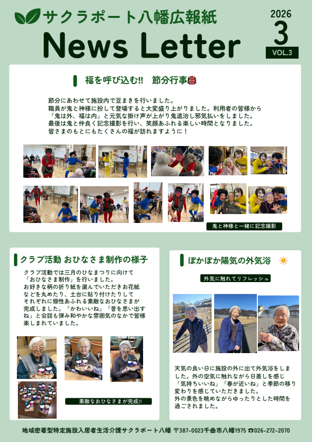 サクラポート八幡です。 今回は2月の節分の様子やクラブ活動、外気浴の様子を載せました。 職員扮する鬼と神様が登場すると大盛り上がり。豆まきで邪気払いをした後は仲良く記念写真を撮りました。 どうぞご覧下さい。